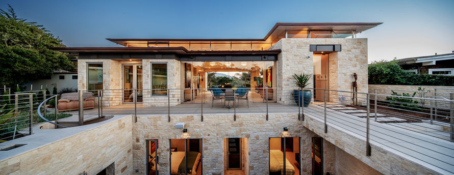 Sand & Sea is a stone monolith residence located on a private cul-de-sac along the ocean side of Scenic Road in Carmel-by-the-Sea. Anchored to its coastal site, the home is punctuated by projecting glass volumes that frame expansive views of the Pacific, creating a deliberate contrast between mass and transparency. A raised roof with clerestory windows draws ambient light into the home from all directions, while a private sunken courtyard offers a sheltered retreat for the bedroom spaces. Above, a roof deck opens northward toward Pebble Beach, extending the living experience into the landscape. The interiors, curated by the owner and local artist René Romero Schuler, layer art and materiality to create a deeply personal expression of place.